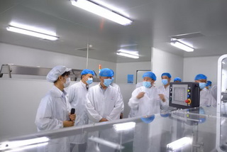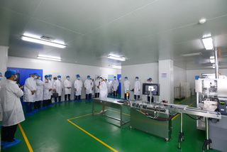 新達制藥經(jīng)理賈法強向市應急管理局領導介紹公司自動包裝生產線